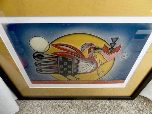 FOR SCALE: One photo has an 8" x 11.5" plain piece of paper sitting inside the frame. Total measurements are about 18" x 18". It's so hard to do art justice in a photograph, I think it looks better in person, so if interested, please come take a look. It was also difficult to get a shot with no reflections. Any odd looking areas are just that. Tried to shoot it from several angles so you can compare.