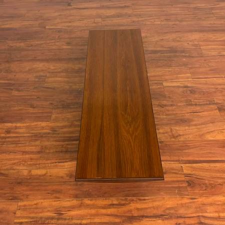 1. Vintage Danish modern teak coffee table with beveled edges and tapered legs with bowtie stretchers. It is a great size for many mid-century styled rooms, not too long or short. It's in good vintage condition with some expected minor wear from age and use. 48" long, 15.75" wide, 16" high. $750.