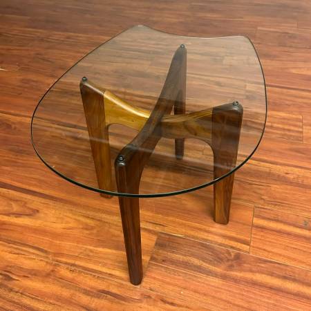 6. Cool vintage 'Stingray' side table by Adrian Pearsall circa 1970's. This piece features a beautifully sculpted walnut base with uniquely shaped thick glass top. The base has been newly refinished, and the glass is in good condition for its age with a couple of scratches. No maker's mark present. 20" wide, 26.5" deep, 19" high. $750.