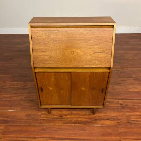 6. Vintage mid-century teak secretary desk, made in the UK circa 1960's. It features simple, clean design with no hardware, sculpted door pulls and octagonal tapered legs. The top door pulls down to reveal cubbies for smaller items, and it becomes a surface for writing or a laptop. At the bottom are sliding cabinet doors that open to storage space with a single adjustable-height or removable shelf. The legs provide room for your feet underneath the desk while sitting in front of it. It's in good vintage condition with some expected cosmetic wear from age and use. 30" wide, 14" deep at bottom, 8.5" deep at top, 42.5" high. The writing surface is 27.5" high. $750.