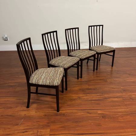5. Set of four vintage mid-century dining chairs by Greaves and Thomas with padded and upholstered seats and slat backs that follow the natural curve of one's back. The wood is a medium brown color and would work well with walnut or other wood types, and the fabric is a nice neutral brown color. They are pretty comfortable, and the curved back offers nice support. Very good vintage condition with wear consistent with age and use. The fabric has a few small spots, and the wood has some scratches that aren't too noticeable. 18.5" wide, 21" deep, 34" high, 18.5" seat height. $595.