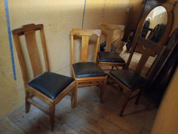 Two identical antique dark oak chair pairs, with new black leatherette cushion seats , $50 each, Also golden oak pair, $50 each, similar "T" back chairs $40-50 each, No tax cash or zelle pickup near...