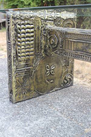 The set is made of sculpted plaster over wood and resembles cast bronze. In the style of Paul Evans furniture.