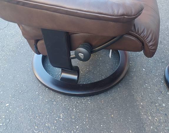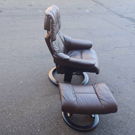 The Reno from Stressless is covered in soft, buttery-smooth leather. There's padding on the seat, back, arms, and headrest, making this the most enveloping lounge chair Ekornes makes. Chocolate brown leather with a dark wood base. Sleep function when reclined (there are videos online that demonstrate). Height adjustable headrest up to 4". Ottoman has adjustable angle with locking mechanism. Original booklet included as pictured. Ground floor pick up with drive-up parking for easy loading. Located a few minutes from Seattle Golf Club in Shoreline, just across the Seattle border.
