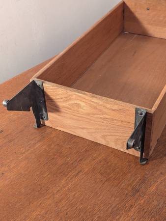 5 drawers total. Left side: 1 regular drawer + 1 file drawer. Right side: 3 regular drawers. A pull-out shelf on each side. Original drawer pulls and dovetail construction. The finish is in good condition with some age-appropriate wear that adds to its character.