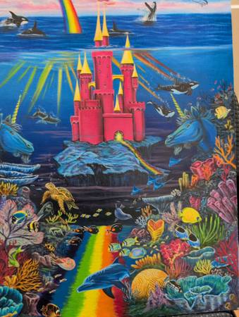 Beautiful fantasy print with princess, Pink Castle and tons of sea life and unicorns. Can't forget the rainbows! Hand-Painted, signed by the artist measure 16 in. X 20 in would look amazing anywhere...