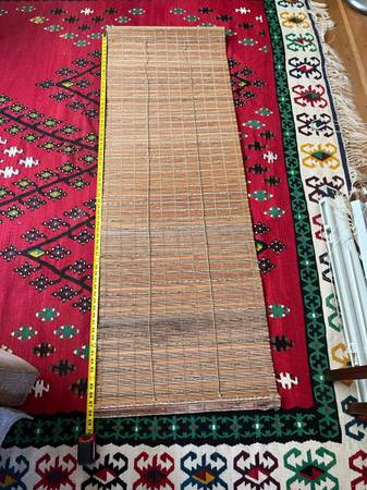 Vintage Roman shade (likely IKEA or World Market but not sure) in rattan. Very easy to install and use. Comes with the wingnuts and brackets to secure into window frame.