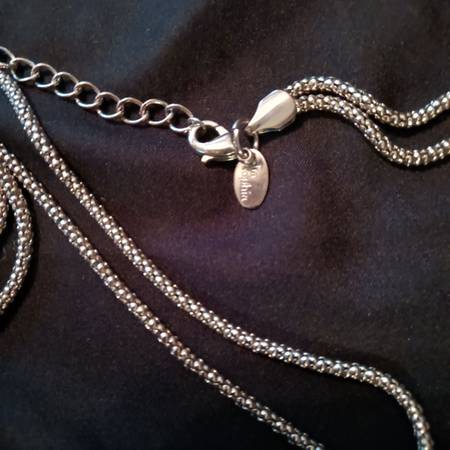 Costume jewelry necklace Once available at home parties No longer being made Extra long with dangling rhinestone, silver tone charms Box available with purchase of this item