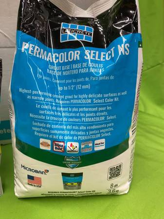 32-lb supply of PERMACOLOR Select NS Grout Base with Frosty (2609) color kits (four 8-lb base bags plus four matching dry pigment color kits). PERMACOLOR Select NS is an ultra-premium, polymer-fortified, unsanded portland-cement grout base designed especially for delicate surfaces like highly polished marble or soft glass. It’s suitable for use in joints up to ½ inch wide. This grout base exceeds ANSI 118.7 standards, is non-shrinking, non-dusting, non-yellowing, easy to clean, and includes built-in Microban® antimicrobial protection to inhibit mold and mildew on the grout surface. All components are new and unopened. Ideal for interior, exterior, and even submerged installations.