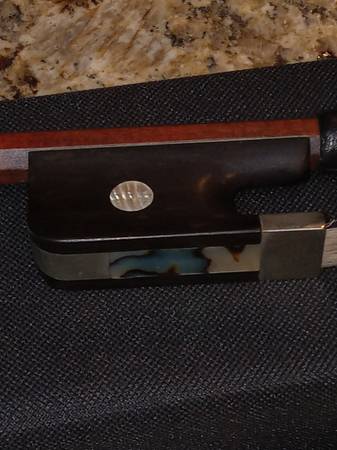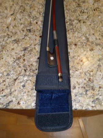 Professional French Bass Bow for sale: Marco Raposo Pernambuco bow made in Argentina. Length - 27” (69 mm). Weight - 140 g. Frog has silver lining with mother of pearl. Rehaired, strong tone, comfortable feel and balance. Suitable for any stage or orchestral work.