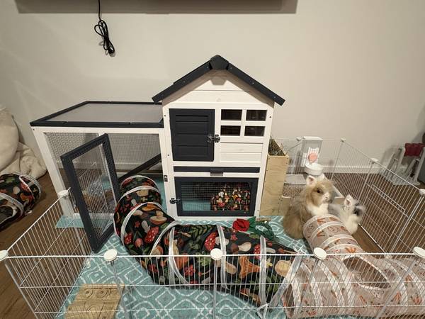 2 Five month old brothers Mini Lionhead Bunnies. They must stay together. Comes with everything and more. Bunny house, playpen, food, treats, grooming kit, feeders, pillows, litter box, toys, etc. Very cute and cuddly. Rehoming fee applies. Call/Text show contact info