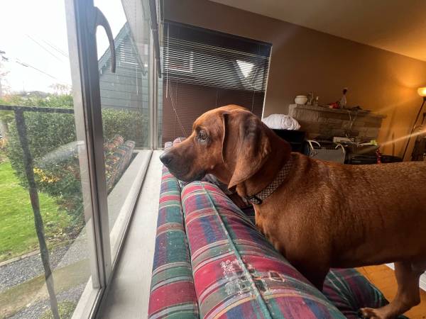 I have an 9 year old, 83 lbs redbone hound who comes with the deal. He can be pretty loud and excited when people come to the door but is very sweet and affectionate.