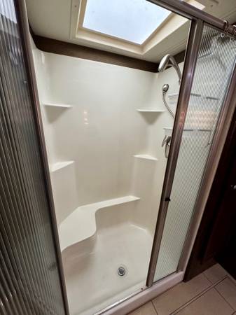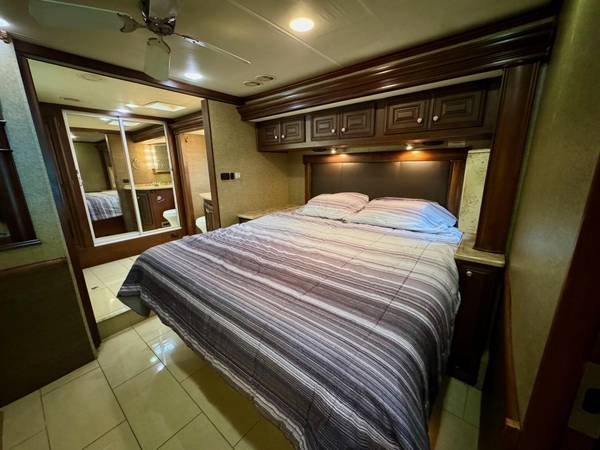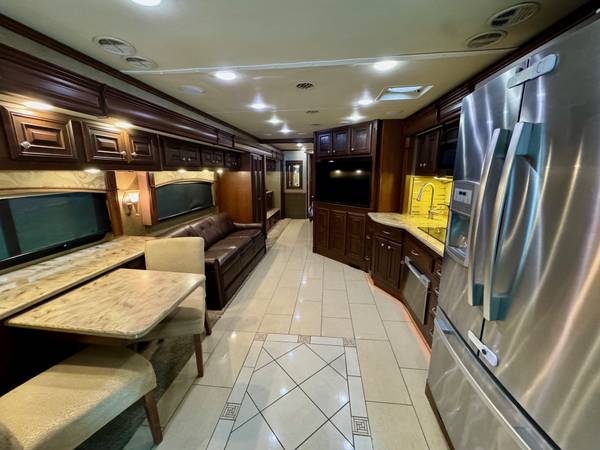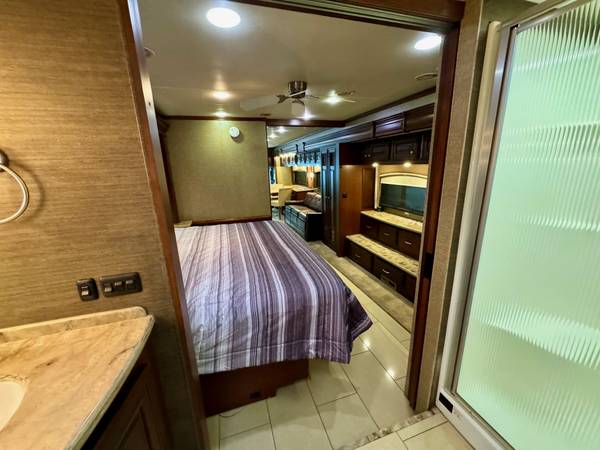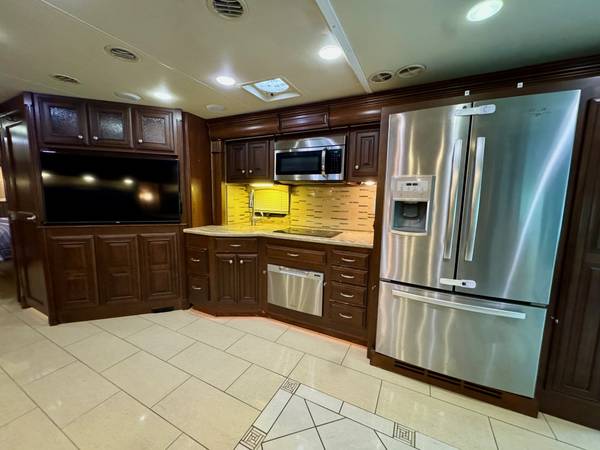 Some of the options are: full body paint, dual power awnings, outside tv, pass through storage bays, heated storage bay, heated holding tanks, keyless entry, 8k onan generator, side view cameras, backup camera, navigation, aqua-hot 400d hydronic furnace & water heating, full kitchen w/ induction stove top, dish washer, residential fridge w/ ice maker/water dispenser, 3 flat screen tv's, buffet dinette, leather sleeper sofa, king mattress in bedroom, stacked washer/dryer, half bath mid hallway (sink/toilet), full bathroom in the back (sink/shower/toilet/closet).