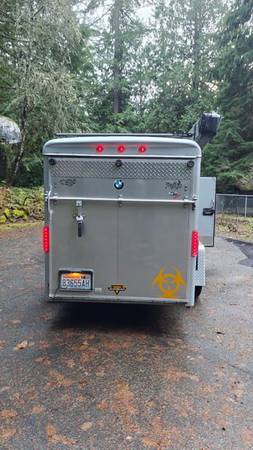 Motorcycle race trailer. Large 270 awning, solar, two victron solar controllers, 2000w inverter, heater, lithium battery, switch over for plug to 12v. Complete insulation, even underneath. Nice little toy hauler for two dirt bikes, two road racers, or one larger ADV. I’ve been using it to keep my enduros safe while in transport and sleeping in it in events. Can tow behind small trucks, very light.
