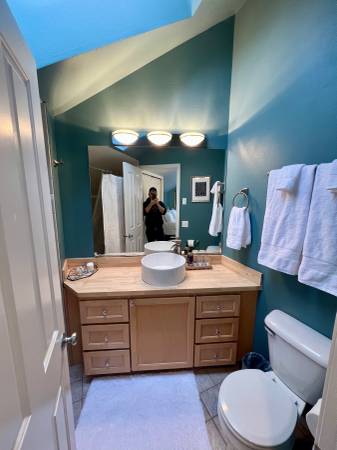 Fully furnished 2-bed, 2.25-bath townhome (1,160 sq ft) is just one block from Beach Drive and public beaches. Located in a peaceful neighborhood, it features an open-concept living and dining area with plenty of natural light, a deck off the living room, and a gas fireplace. The kitchen boasts stainless steel appliances. Both bedrooms have vaulted ceilings, with the master bedroom offering an en-suite and double closets, skylights. With an attached garage, a dedicated parking space, and a private backyard for your relaxation, this home offers a perfect spot to unwind. Enjoy sunsets on Alki beach, dining, and cafes.