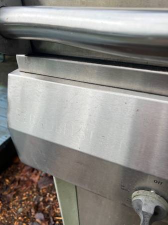 'Steelman' grill by Straublestone. This is a really high quality grill but it's had a lot of use. Needs deep cleaning & some TLC. Needs a caster put back on & could use new grill grates--they are partly rusted through. We got it second hand from some neighbors and used it with a cast iron grill pan so never cooked directly on the grill surface. Push-button ignition no longer works but both burners light easily with a lighter.