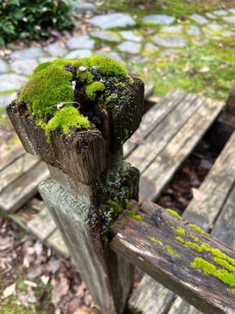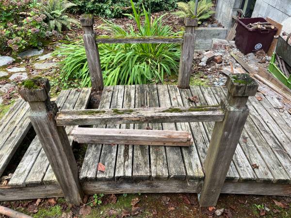 Bridge was made over 30 years ago by father in-law. Wood Bridge with nice detail, tapered edges, 4 posts with notched railings. Wear, moss and some rot on runners. It is 96"L x 40"W x 34"T. Could potentially be fixed up. Looks very cool despite age and wear. See pics. It is one piece fairly heavy and I can help you load it up. Two people can move it, but may not be able to lift it say onto a truck. Thanks.