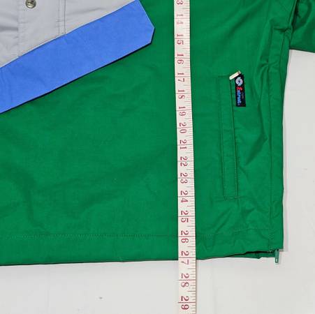 Sick 90s design, block color, 3/4 zip and snap closure. Front zipper pocket with velcro closure. Side zipper pockets with open side zipper, toggle draw string on hem, elastic cuffs and YKK zippers. Entrant water resistance fabric.
