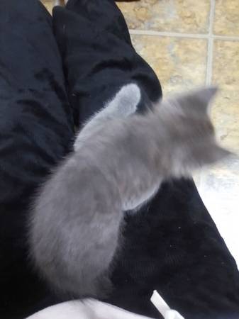 Male Grey Kitten, 8 weeks old. Stubby tail. Fluffy. There is a rehoming fee, message me for details. )