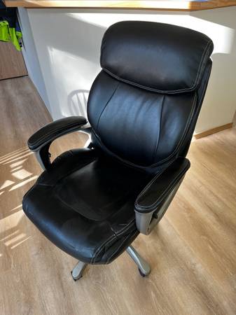 Comfy leather office chair. Adjustable height, can recline, and rolls on wheels. Small tear in the leather on the top right on the back (see last photo).
