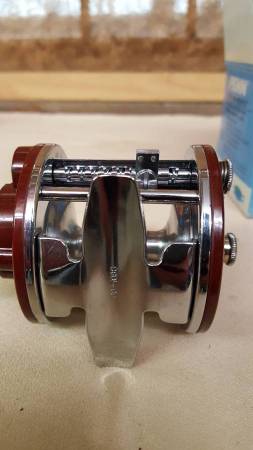 New in box 1960's vintage Penn Peer 109 RH retrieve level wind baitcaster with dual green handles, star drag, metal spool, instruction/parts manual, lube tube, and Penn wrench. Metal cornered box with original price sticker. Never been used. Made in the USA. Great all-purpose reel: bottomfish, salmon, steelhead. Rugged high quality reel as nice as they get. $125.00