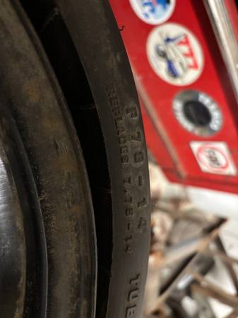 Three compact spare tire and wheels all three for $30.00. F78 14". Hot rodders like them because of their small size.