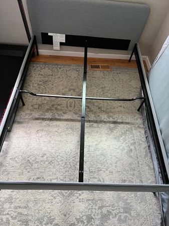Like new IKEA upholstered headboard, frame and mattress. very clean protected by mattress cover and barely slept on. Used as decorative furniture in spare bedroom.
