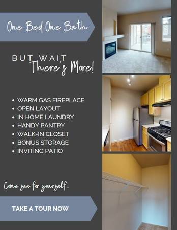Fantastic one bedroom. Offering great storage and a covered patio. With touches like a gas range, gas fireplace, and full-sized washer, dryer look no further.