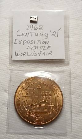 A 1962 Seattle Worlds Fair Commemorative Coin and a '21' Worlds Fair Exposition Clutch Pin. Excellent Condition