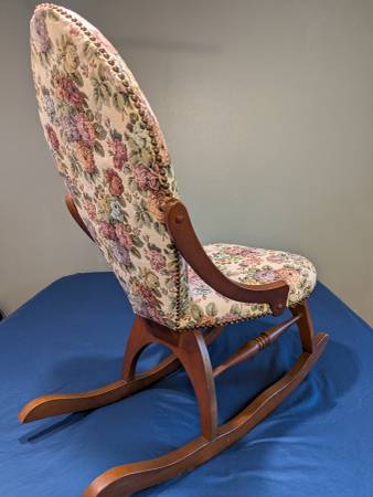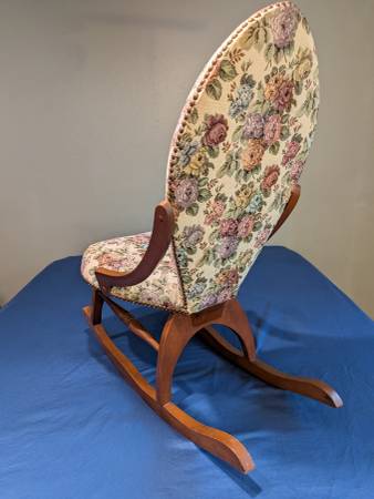 Very nice Vintage Petite Sewing Slipper rocking chair. 34 1/2" Tall (14 1/2" at Seat) X 15 1/2" Deep X 18" Wide. You would search far to find, enjoy and use this floral print antique treasure slipper chair. The fabric is in good condition with minimum wear.