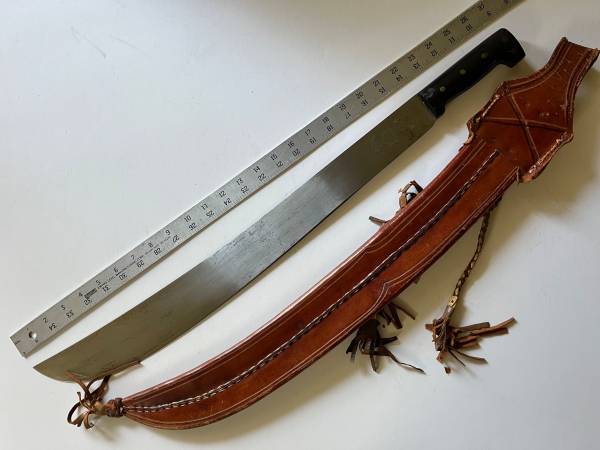 Leather scabbard. Looks like it has never been used for hacking or chopping.