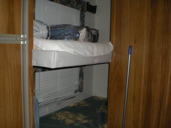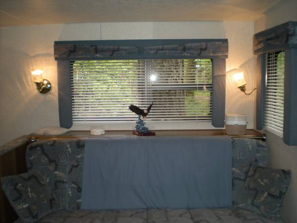 Sit on your covered deck with skylight and discover your creativity with cooking on the fire with your cowboy kitchen. Find your inner chef in the great outdoors. Quiet loop for your relaxation even in the rain. The Sandpiper with rv roof has bunk beds and a hide a bed for your family and the queen sized bed is up on the 5th wheel above the hitch for more privacy. Roomy for it's size and newer laminate flooring for cleanliness. Dehumidifier keeps moisture from being an issue and the electric heater helps your comfort too.