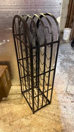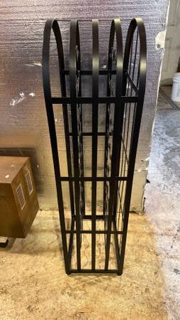 Looks and works great. Few tiny scratches on top can barely see. Approximately 45” high. Tilts bottles downward. Sturdy metal. Freestanding