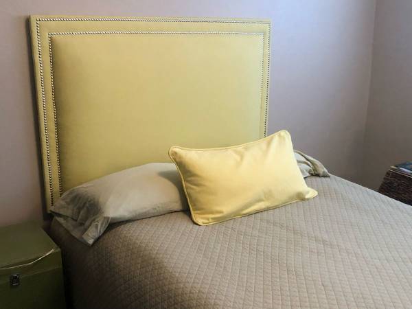 Custom headboard, upholstery grade cotton fabric. 36”h x 56”w x 3-4” d, non-smoking, no pet household. Hangs on the wall with French cleat hardware (not included). $60 obo, cash only.