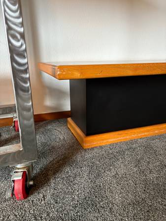 Vintage 1980s modern and contemporary coffee table. Wrapped in oak with black laminate top and sides. A few scuffs, around the edges that can easily be cleaned up. Black laminate both top and bottom...