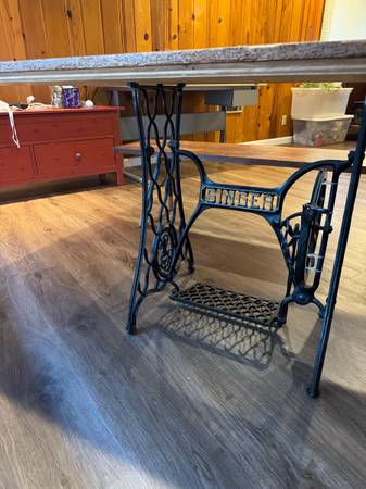 Beautiful dining table made with original singer sewing machine base. Table top is refinished wood panels from a 100+ year old snohomish barn.