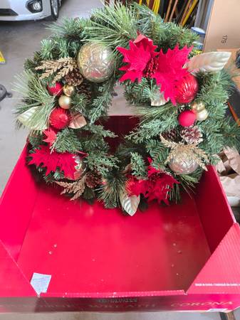 Beautiful Hunter Holiday 30-inch classic Christmas wreath, originally purchased from Costco. This is a high-quality artificial wreath featuring lush greenery, red poinsettias, pinecones, and gold...