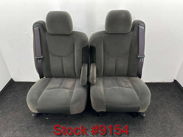 Set of gray cloth bucket front seats removed from a 2004 Chevy Silverado 1500 extended cab truck. The seats are Dark Gray (Chevy calls it "Very Dark Pewter"). The driver's seat is power directional with a manual seatback. The passenger's seat is manual directional with a manual seatback. The driver's has some light fabric pile wear, fabric is still strong and foam is still firm and in good condition.
