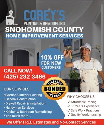 Corey's Painting Company is offering professional residential painting at affordable prices. We are licensed, bonded and insured with 20+ years painting experience serving Snohomish and surrounding counties. All estimates are free and pictures and references of our work are always available, so call us today and schedule an appointment.