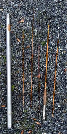 3 pc. bamboo rod, good guides and wraps, decent finish and cork, no markings.
