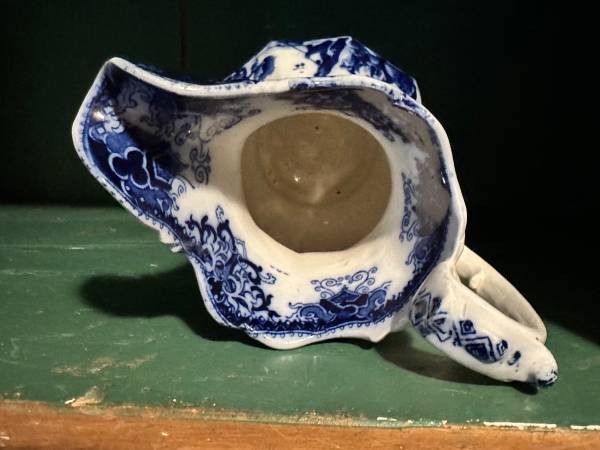 Nice antique flow blue transfer ware pitcher by unknown maker, England. Ethereal Chinese temple, people in a boat, a mother swan and her young cygnets, and mountains. Had this vintage piece been left as white ironstone, it has a beautiful raised feathered floral leaf motif to the spout. 8.25" tall. Small chip to scalloped base.