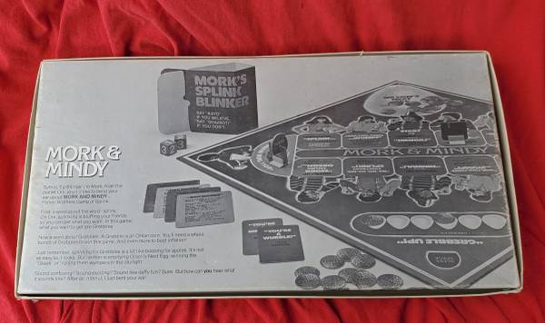 "Meet Mork. He's from Ork, and he's come to Earth to learn all he can about our planet. To win the hearts of Earthlings everywhere, Mork has brought along this crazy Orkan game. In it, you and your opponents move around a special Orkan board doing such out-of-this world things as "splinking" and "grebbling up." All the while, you'll be trying to win coins called Grebbles. But don't panic. Mork and his Earthling friend Mindy will be there to help. So shake hands Orkan style, and begin!