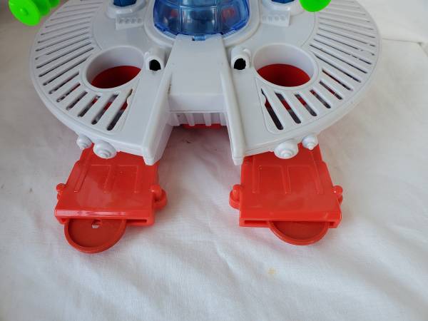 Raise it for launch, which will fire some of the discs, then lift it off to take pretend flights. Push the button on the back to continue to fire discs. There is also a battle mode, in which the shuttle interacts with and attacks the rover.