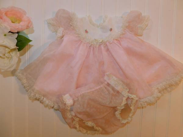 Vintage Bryan baby girls dress and plastic vinyl lined diaper cover. Size states M. Maybe a size 3-6 months. Full circle sheer lined dress with curly lace. This cutie is old!
