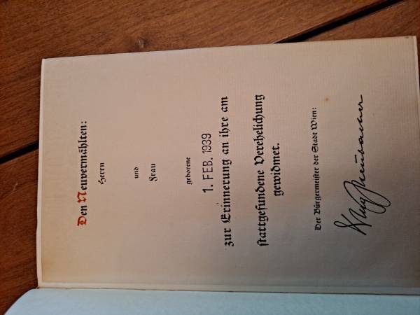 Mein Kampf 1938, tan color with black back, gold on top of pages. It is a dedication to man and lady for having a child. Stamped 1939 and signed by the Burgermeister of Vienna. Found in an attic in Salzburg, Austria in 70s. Excellent cond. Like new. Also have an English version dated 1943 Mass. USA Call to inquire. $1400 for both. FIRM