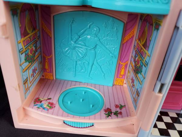 The floor of the studio is a spinning stage, for those special presentations. Transform it into the dancer's dressing room, with a pink dressing screen, vanity, and jukebox/sound system.