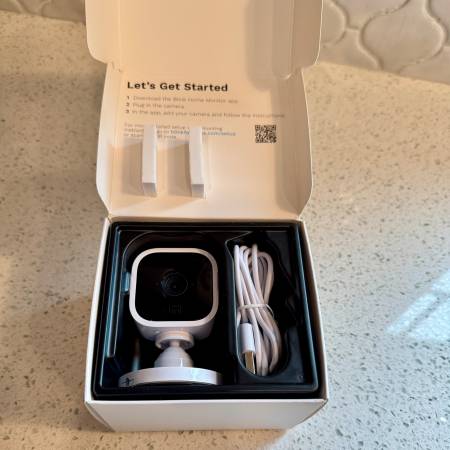 Blink Mini Compact Indoor Plug-in HD Smart Security Camera in White Never used and in nearly-new condition. My husband purchased this and decided to go with a different system for our home....