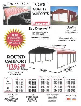 Tarriff Taxes Could Effect the Prices So Act Now! Hi! We are Rich's Quality Carports! We Have Been Selling Quality Carports for Over 14 Years! We Can Get Your Carport Ordered the Fastest! 7 Days a Week! We Sell a 12' X 21' Metal Carport Starting at $1295.00!! Plus, Tax! Price Includes Delivery and Install! We Can Build Most any Size! Custom Buildings??? No Problem!! Built on Your Level Lot! We Price Match any Written Estimate! We Build Anywhere in Washington, Oregon and Idaho! Your Choice of Colors! Don't Wait! Order Today! A 13% Deposit Gets it Ordered! Balance Paid Upon Delivery! Stop By and Check Out Our Display Models! We Have a 24' X 36' Fully Enclosed with Roll-Up Doors! A 24' X 26', 12' X 31' and a 12' X 21' on Display! The 24' X 26' and 24' X 36' can only be viewed from outside! See at 406 McNaught St. S. Roy WA 98580. NOTE! B & C Motorsports Do Not Know Anything About the Carports and Can Not Write Up the Orders! Call Me for That! My Cell is 360-451-5214!