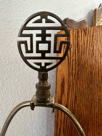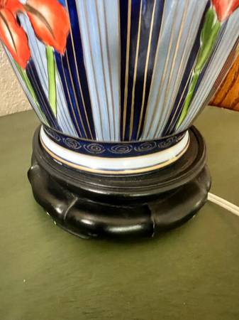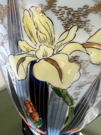 This is a vintage Asian-style porcelain or ceramic table lamp, likely from the mid-to-late 20th century, with a hand-painted floral (iris or lily) design and a distinctive Chinese character finial. The design style is similar to Japanese Otagiri or Chinese Famille Rose porcelain. Possibly a 3-way lamp. I used only a regular bulb.
