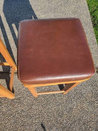 I have two beautiful oak barstools. I am moving so these must go to another loving family, since I have no need of them in my new residence. There is a padded 2" seat, and glides on each foot. There is ONE leg/foot that looks like a pet chewed on occasionally, but I just noticed it-I do not know when this happened.